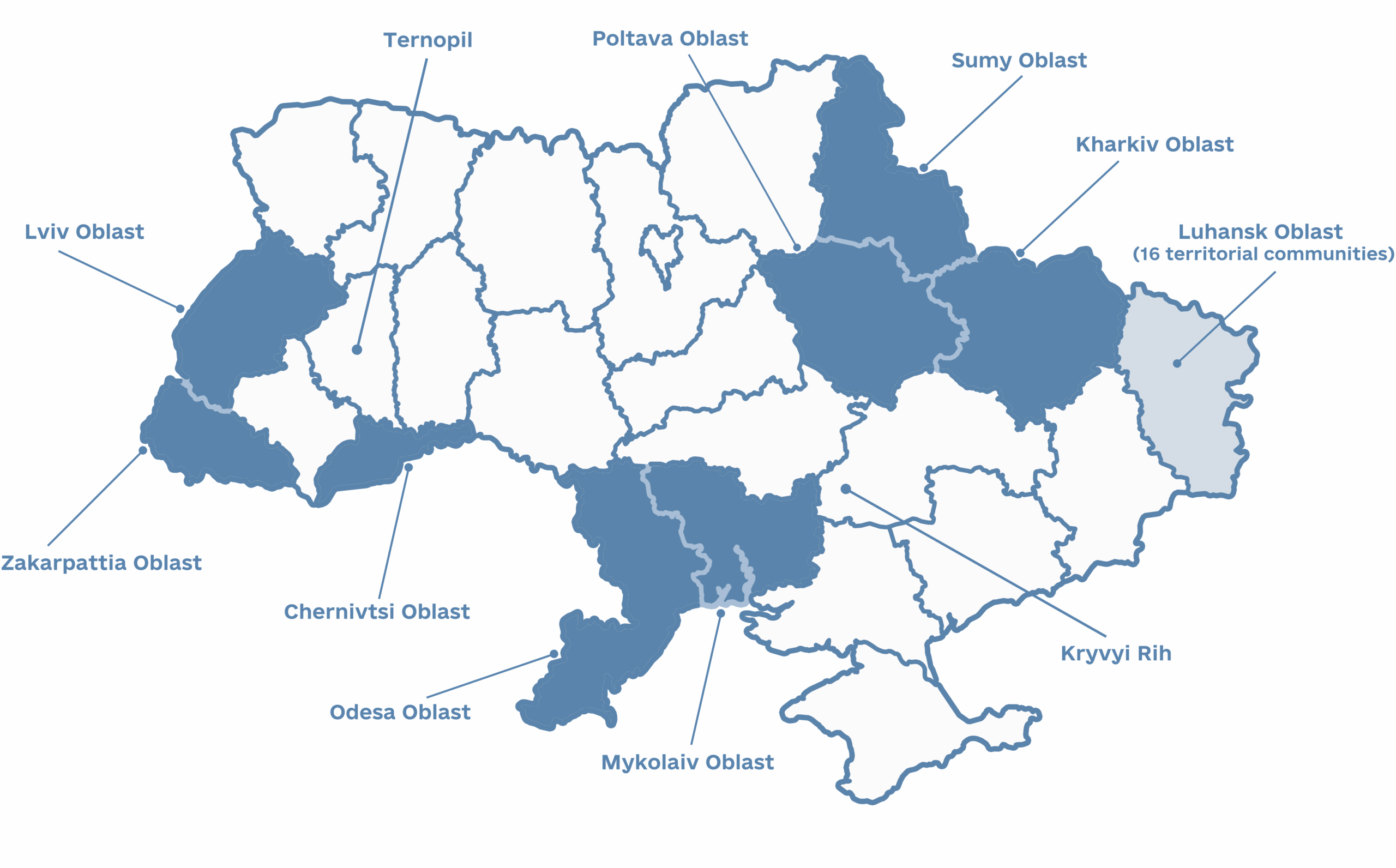 Sievierodonetsk UH (urban hromada), Lysychansk UH, Popasna UH, Rubizhne UH, Hirske UH, Kreminna UH, Bilokurakyne SH (settlement hromada), Markivka SH, Bilolutsk SH, Nyzhnioteplivka SH, Lozno-Oleksandrivka SH, Novoaidar SH, Shyrokyne SH, Stanychno-Luhanske SH, Chmyrivka SH, Bilovodsk SH