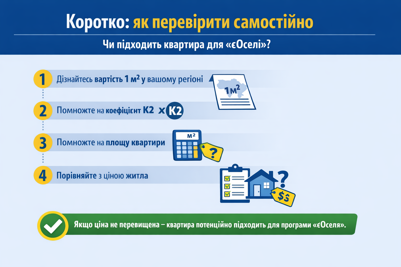 З урахуванням оновлених показників та застосування коефіцієнтів максимальна вартість житла для Києва становить 60 162 грн за 1 кв. м Наприклад, якщо сім’я планує придбати квартиру 50 кв. м у Києві, то максимальна вартість, яка може бути профінансована в межах «єОселі», становитиме 3 008 100 грн (50 × 60 162 грн). Тобто квартира вартістю до 3,0 млн грн може бути профінансована банком-партнером у межах програми (за умови відповідності іншим вимогам «єОселі»).